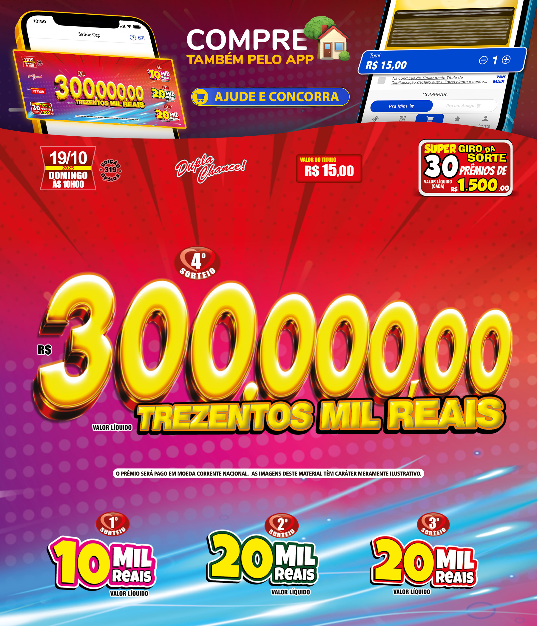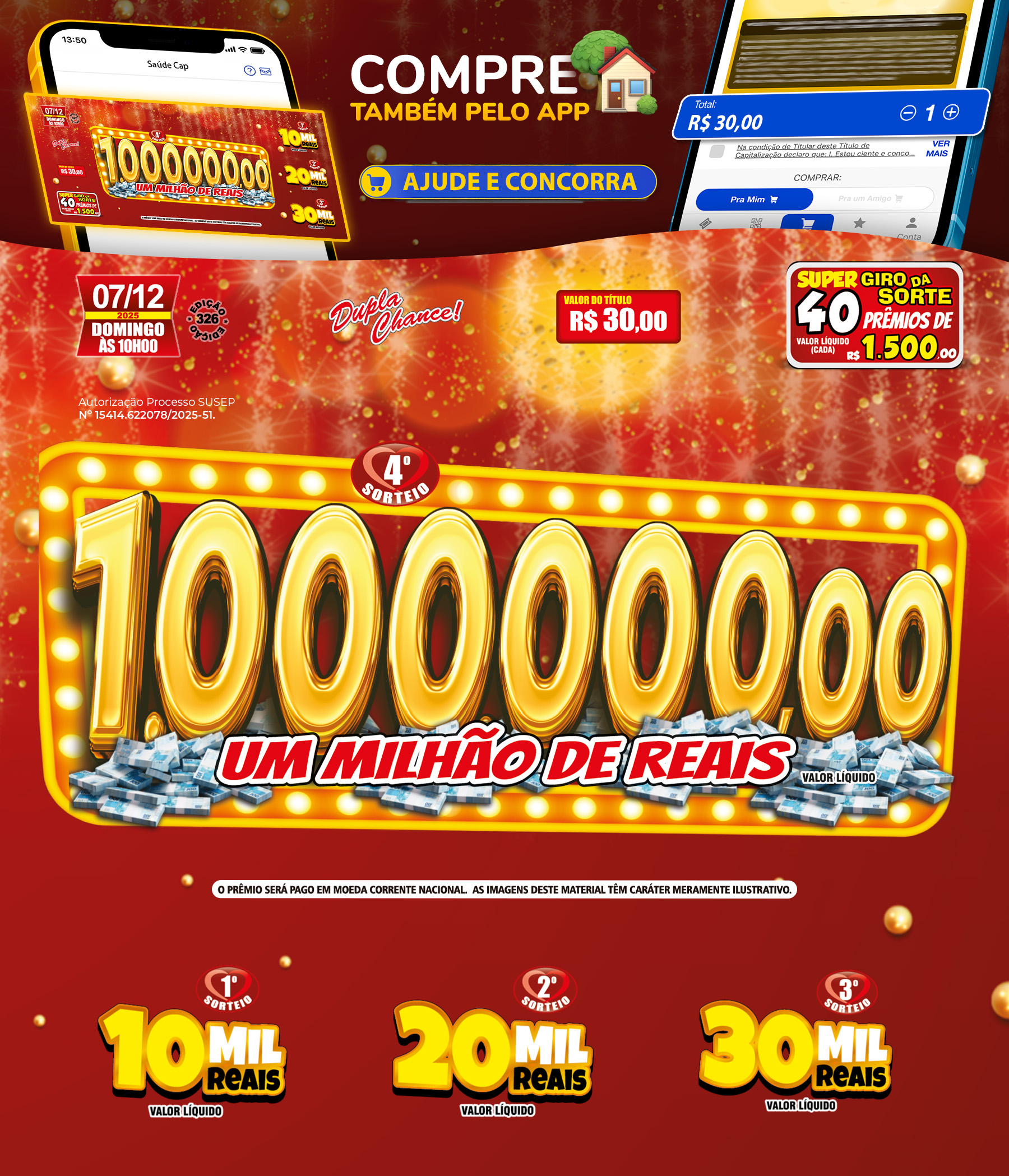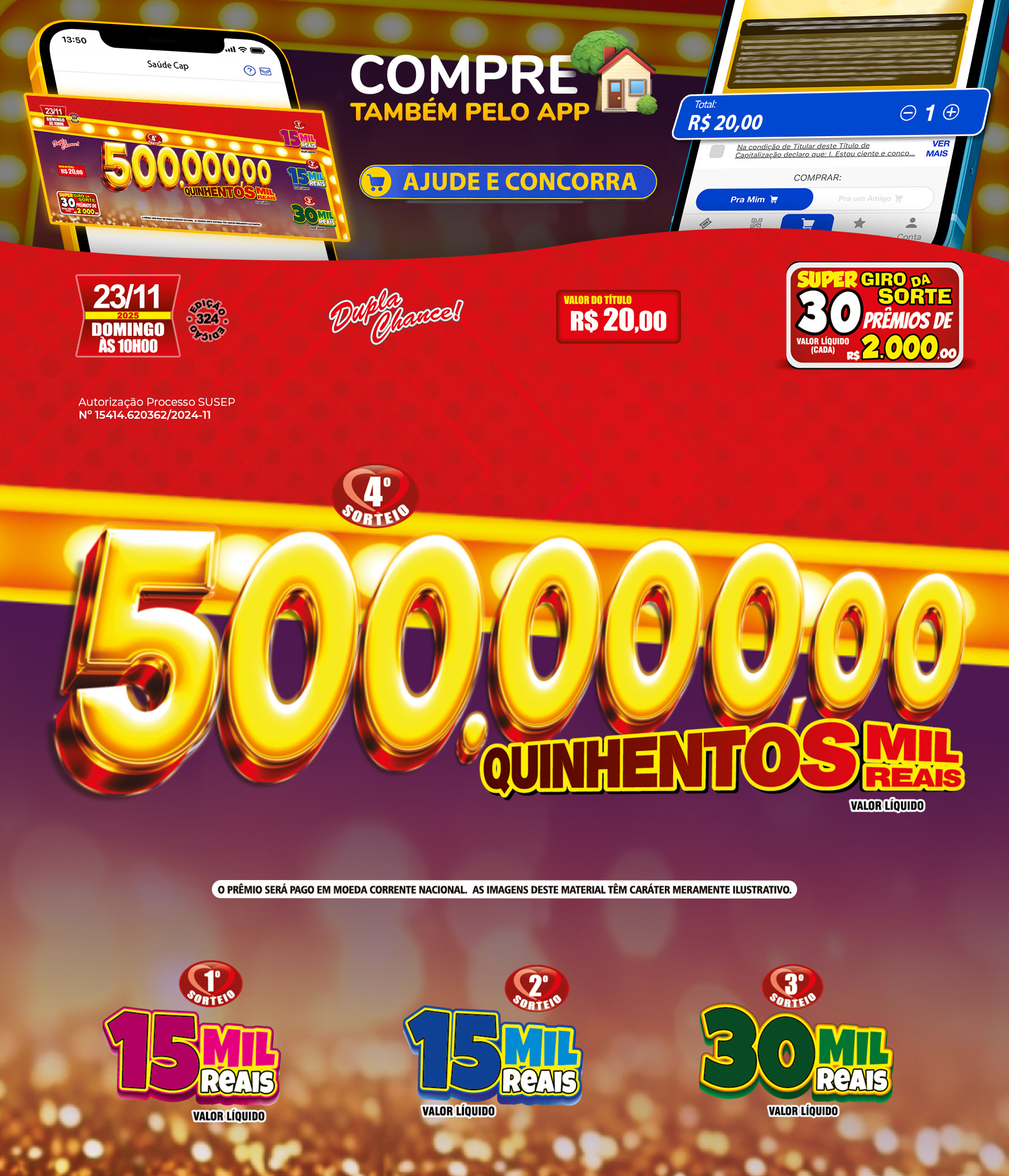 Compre seu título até as 23:59 do sábado sem sair de casa em apenas alguns passos 📲 Além disso, você pode acompanhar ganhadores, novidades e muito mais sobre o Saúde Cap! Baixe já 🍀