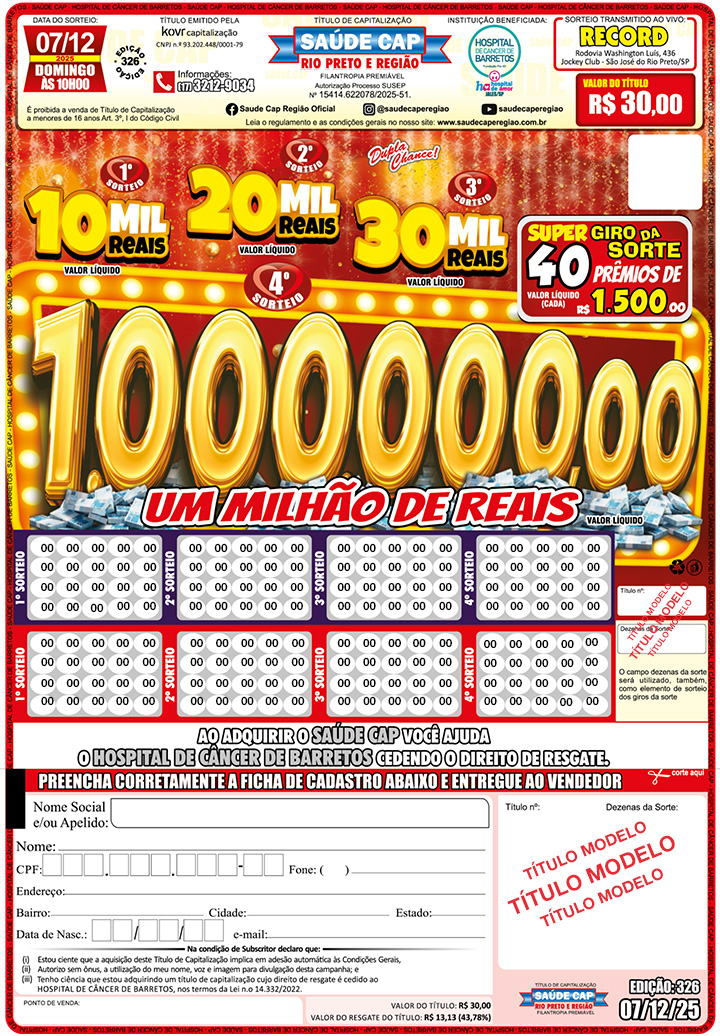 Sorteios transmitido AO VIVO pela Record TV e You Tube todos os Domingos às 10h00.