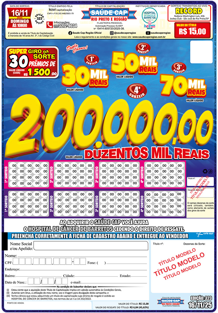 Além de concorrer a valiosos prêmios, você ajuda o Hospital de Amor (Hospital de Câncer de Barretos/Fundação Pio XXII), cedendo o direito de resgate do título.