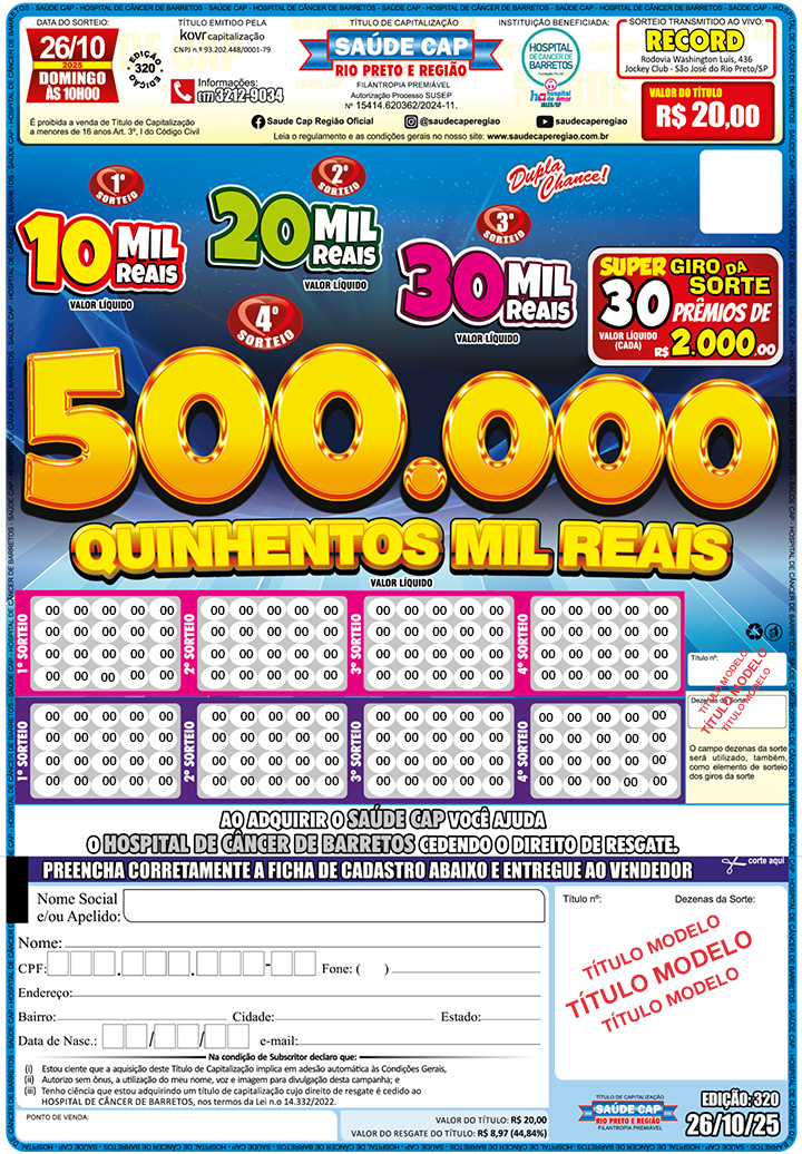 Além de concorrer a valiosos prêmios, você ajuda o Hospital de Amor (Hospital de Câncer de Barretos/Fundação Pio XXII), cedendo o direito de resgate do título.