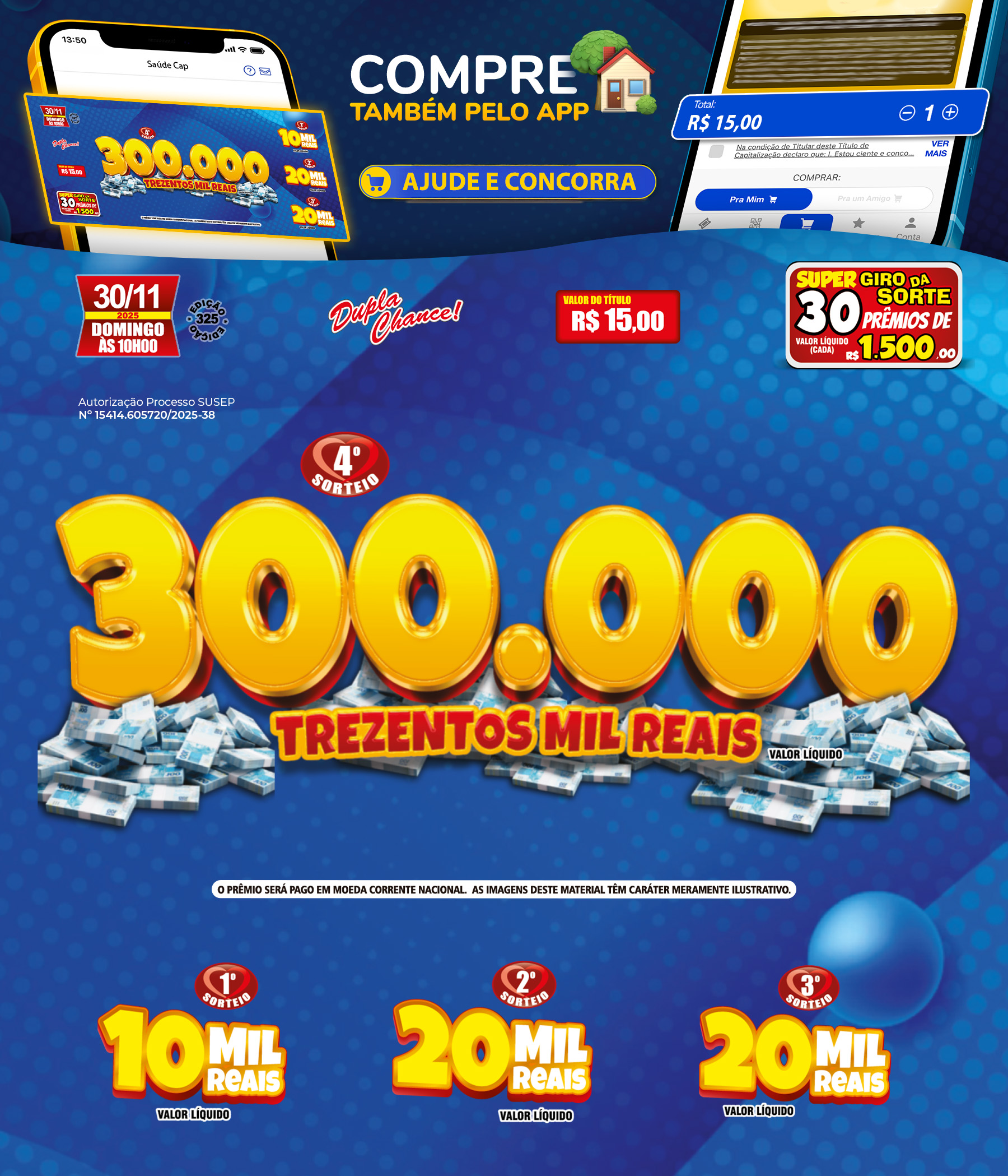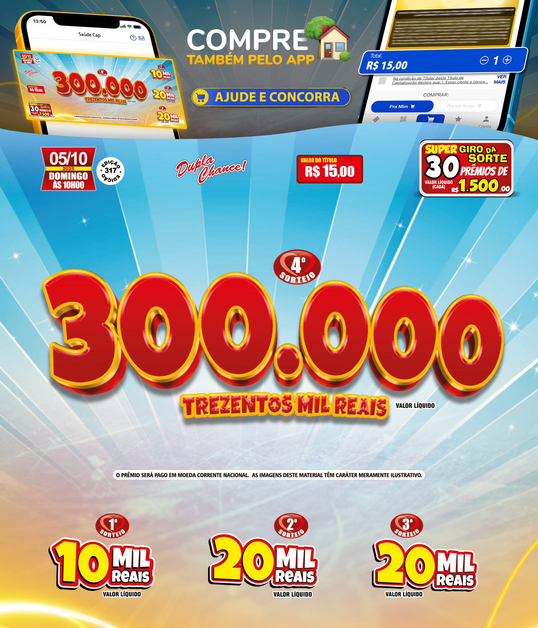 Compre seu título até as 23:59 do sábado sem sair de casa em apenas alguns passos 📲 Além disso, você pode acompanhar ganhadores, novidades e muito mais sobre o Saúde Cap! Baixe já 🍀