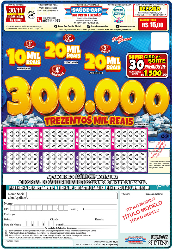 Sorteios transmitido AO VIVO pela Record TV e You Tube todos os Domingos às 10h00.