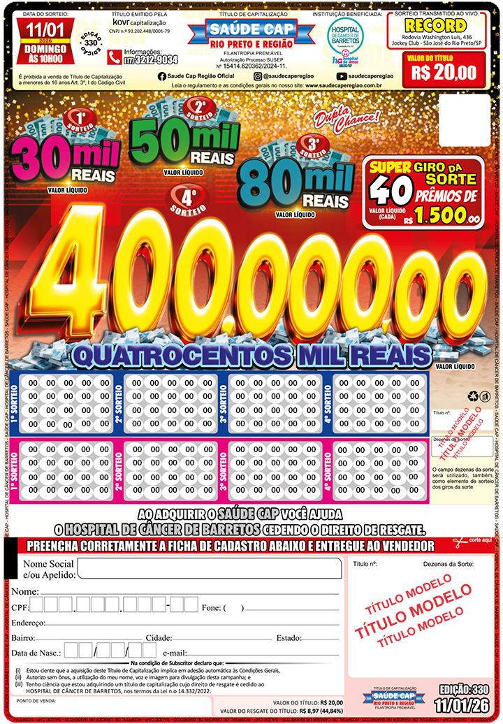 Além de concorrer a valiosos prêmios, você ajuda o Hospital de Amor (Hospital de Câncer de Barretos/Fundação Pio XXII), cedendo o direito de resgate do título.