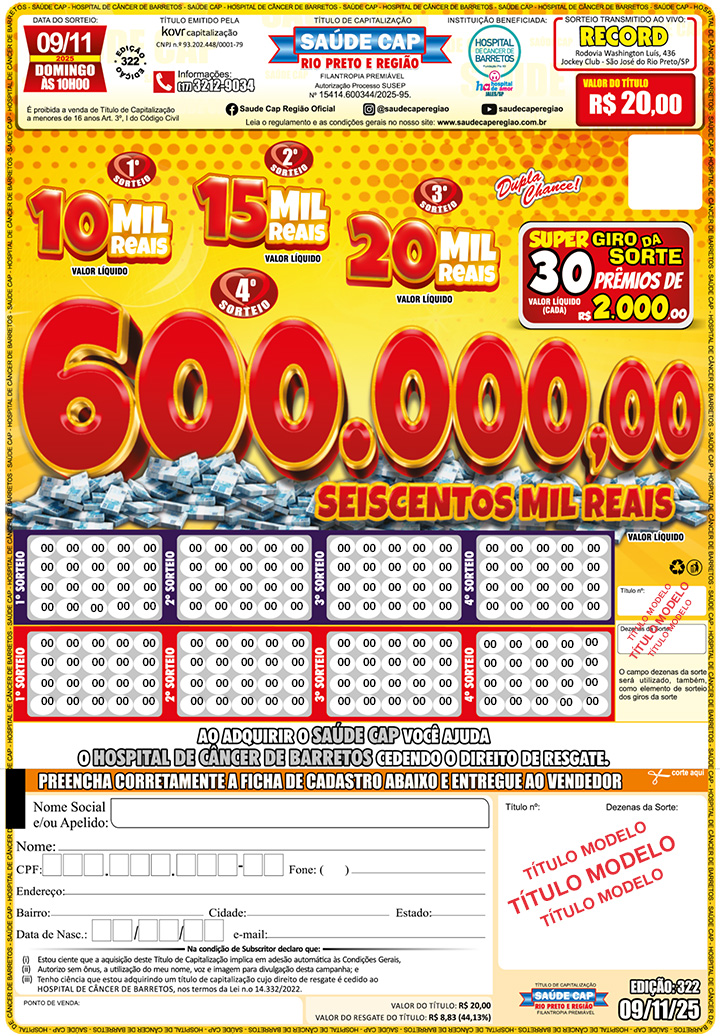 Além de concorrer a valiosos prêmios, você ajuda o Hospital de Amor (Hospital de Barretos/Fundação Pio XXII), cedendo o direito de resgate do título.