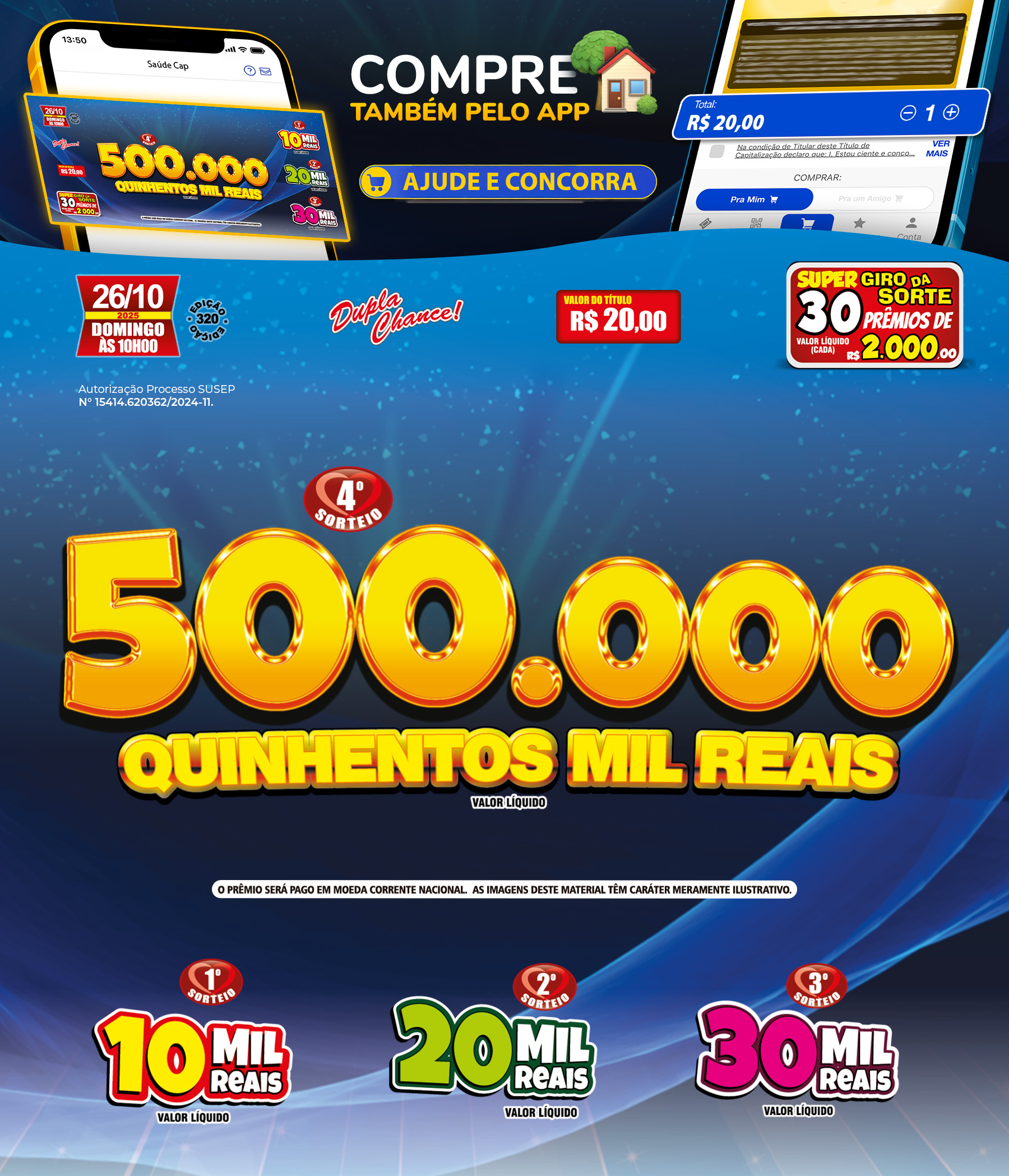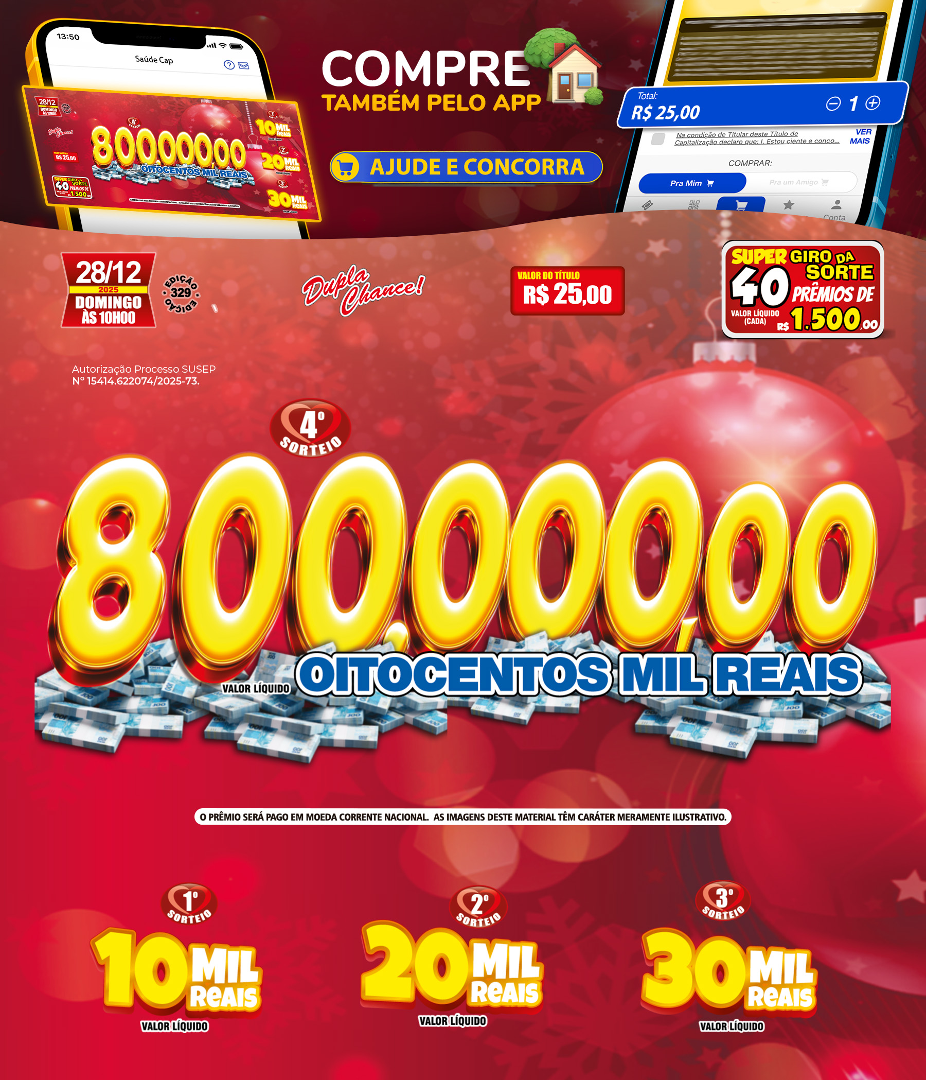 Compre seu título até as 23:59 do sábado sem sair de casa em apenas alguns passos 📲 Além disso, você pode acompanhar ganhadores, novidades e muito mais sobre o Saúde Cap! Baixe já 🍀