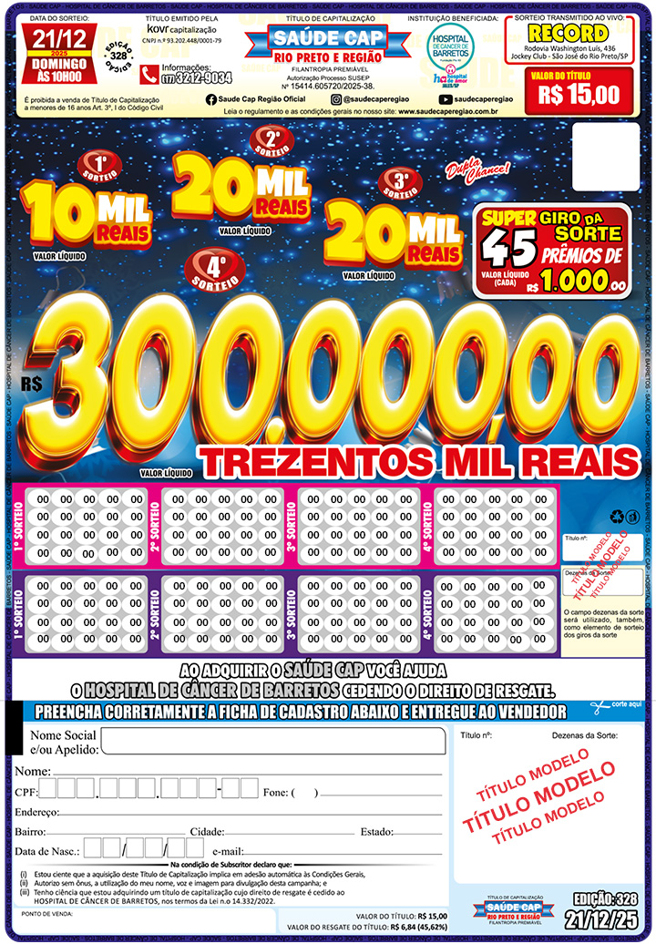 Além de concorrer a valiosos prêmios, você ajuda o Hospital de Amor (Hospital de Barretos/Fundação Pio XXII), cedendo o direito de resgate do título.